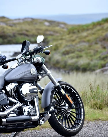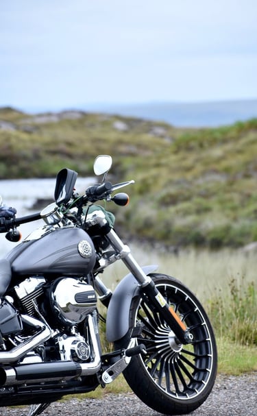 Cruising through misty glens and rugged hills on my motorbike.