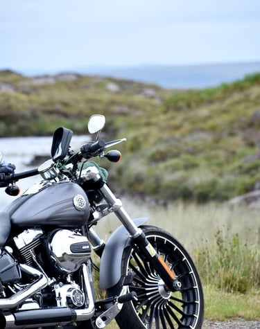 Cruising through misty glens and rugged hills on my motorbike.